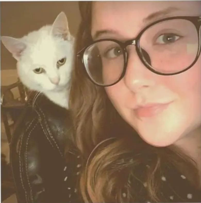 A woman is sitting in a leather chair with a cat sneaking into the frame. At first, the cat might seem like part of her clothing, but a closer look reveals its playful photobombing presence.